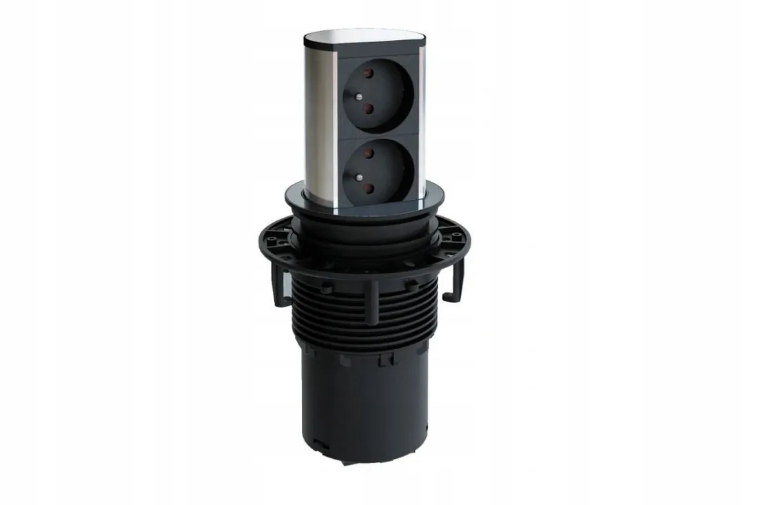Instalacja jest niewiarygodnie prosta. Kolumnę ELEVATOR umieszcza się w wyciętym otworze o średnicy 79 mm i mocuje do mebla za pomocą pierścienia blokującego.