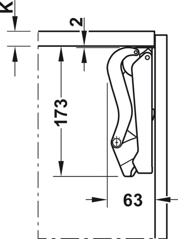 Podnośnik nadaje się do korpusów o szerokości do 1 800 mm oraz wysokości od 225 do 650 mm. Głębokość zabudowy wynosi 63 mm, dzięki czemu okucie sprawdza się w większości standardowych konstrukcji meblowych. Obudowa wykonana jest z tworzywa sztucznego, natomiast ramię dźwigni i dźwignia podporowa wykonane są ze stali wykończonej w kolorze niklowanym.