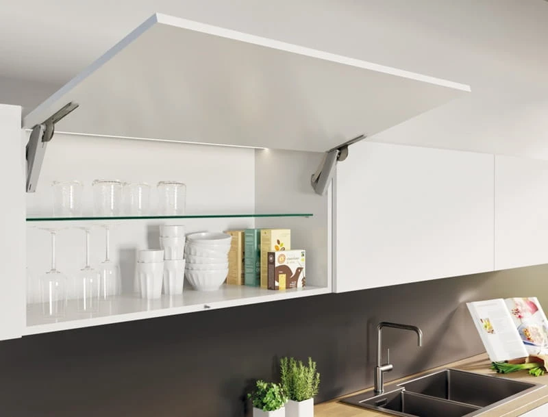 Model F umożliwia płynną i wygodną obsługę klap o różnych wymiarach. Montaż frontu odbywa się bez użycia narzędzi — wystarczy nasunąć go na przygotowane ramię dźwigni. Mechanizm zapewnia stabilne działanie, ułatwiając dostęp do wnętrza szafek kuchennych, pokojowych i gospodarczych.