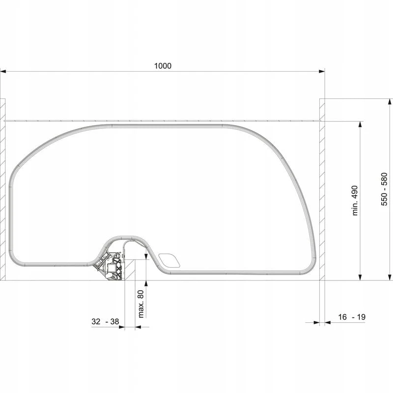 System montuje się zgodnie z dołączonym szablonem. Półki można montować i demontować bez użycia narzędzi. Przeznaczony do szafek o minimalnej głębokości 490 mm i wysokości wewnętrznej 611 mm.