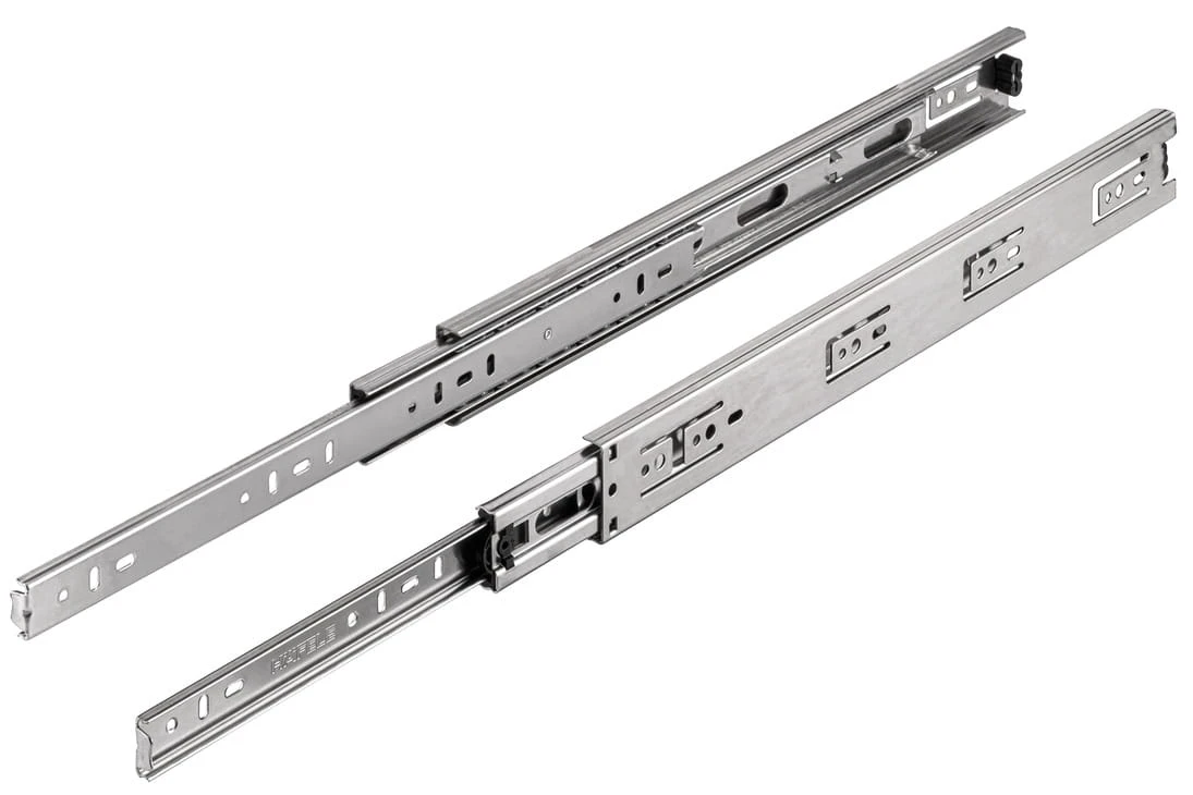 Wytrzymała prowadnica kulkowa Hafele zapewniająca pełny wysuw oraz komfort codziennego użytkowania szuflady.