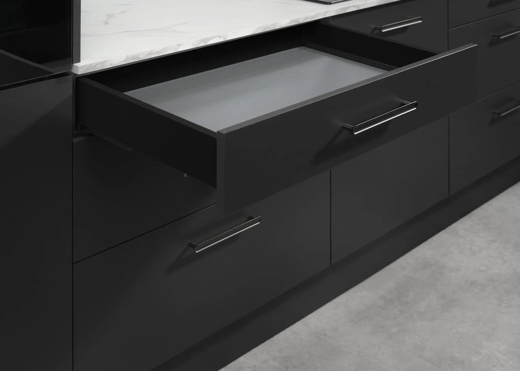 Minimalistyczna, cienkościenna szuflada Matrix S Slim stworzona do nowoczesnych mebli, zapewniająca pełny wysuw i cichy domyk.