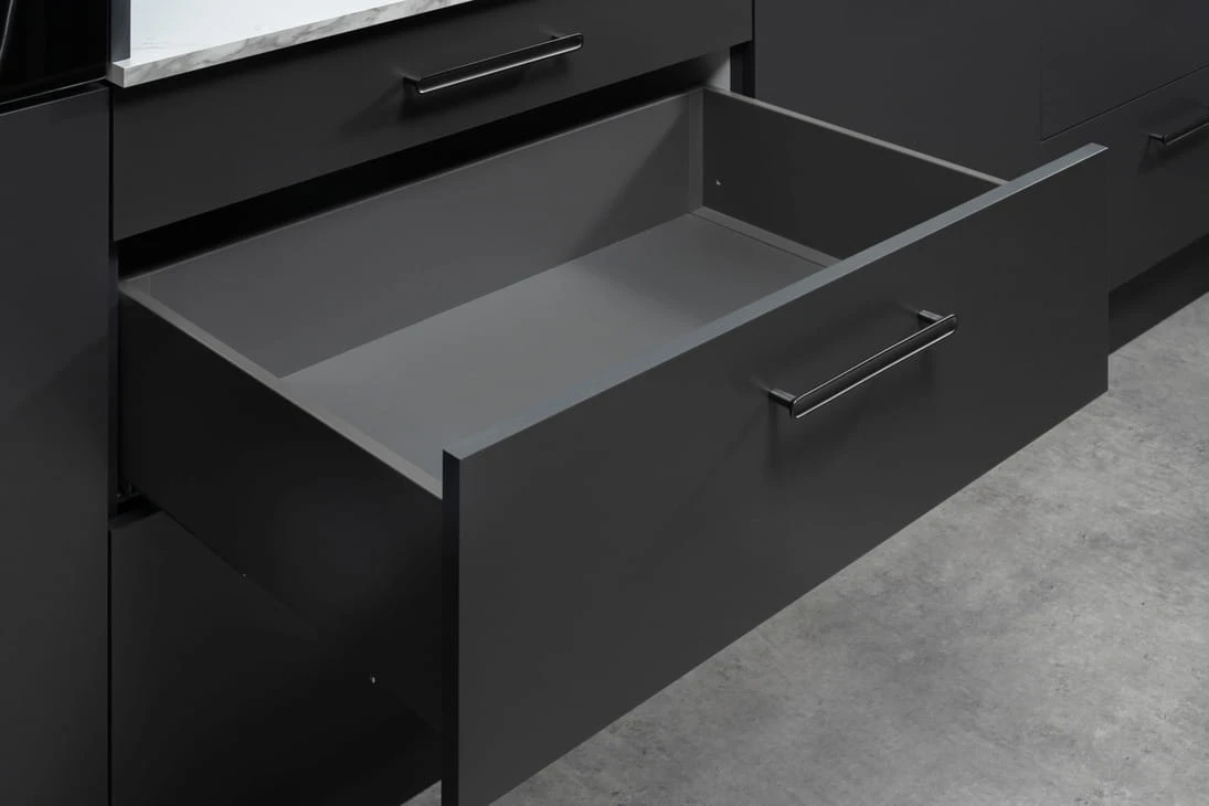Szuflada Matrix S Slim dzięki prostym i minimalistycznym bokom pasuje do każdego wnętrza, zarówno kuchni, garderoby, jak i do mebli wolnostojących. Sprawdzi się w frontach wpuszczanych, jak i nakładanych. Cienkie ścianki boczne zapewniają maksymalne wykorzystanie powierzchni do składowania.