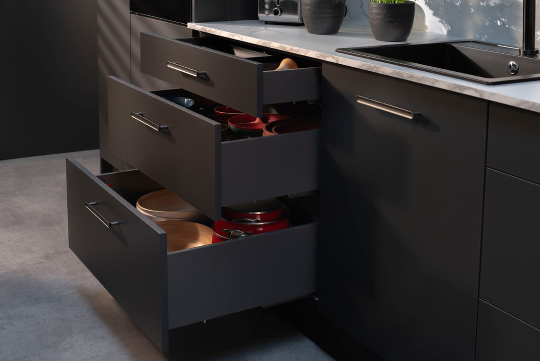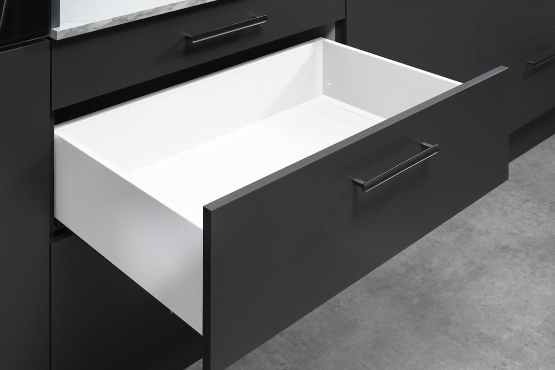 Szuflada Matrix S Slim dzięki prostym i minimalistycznym bokom pasuje do każdego wnętrza, zarówno kuchni, garderoby, jak i do mebli wolnostojących. Sprawdzi się w frontach wpuszczanych, jak i nakładanych. Cienkie ścianki boczne zapewniają maksymalne wykorzystanie powierzchni do składowania.