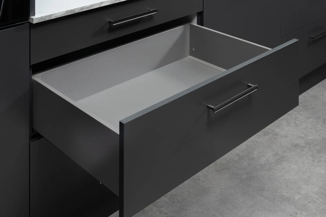 Szuflada Matrix S Slim dzięki prostym i minimalistycznym bokom pasuje do każdego wnętrza, zarówno kuchni, garderoby, jak i do mebli wolnostojących. Sprawdzi się w frontach wpuszczanych, jak i nakładanych. Cienkie ścianki boczne zapewniają maksymalne wykorzystanie powierzchni do składowania.