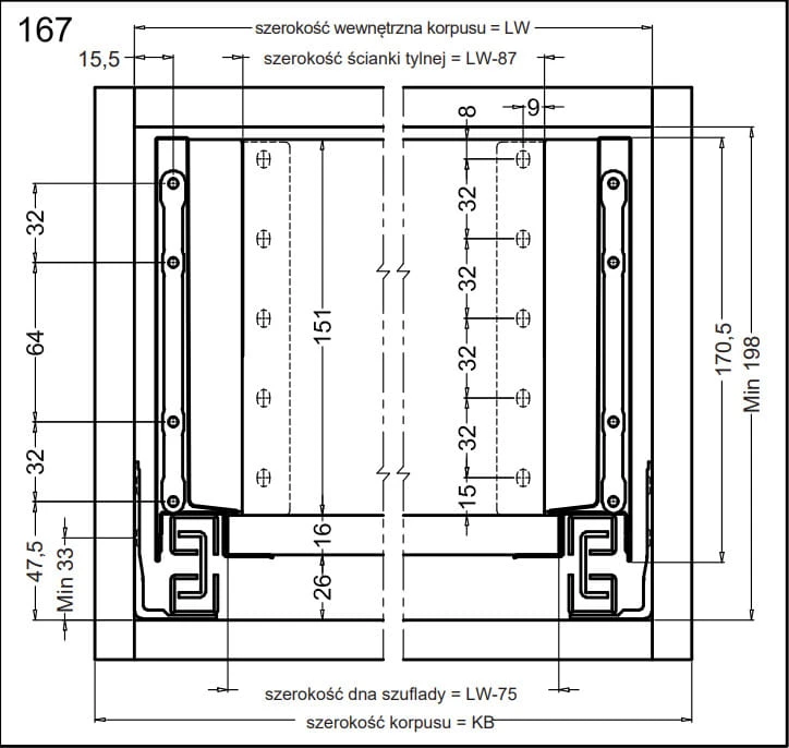 - Wysokość szuflady: 167 mm