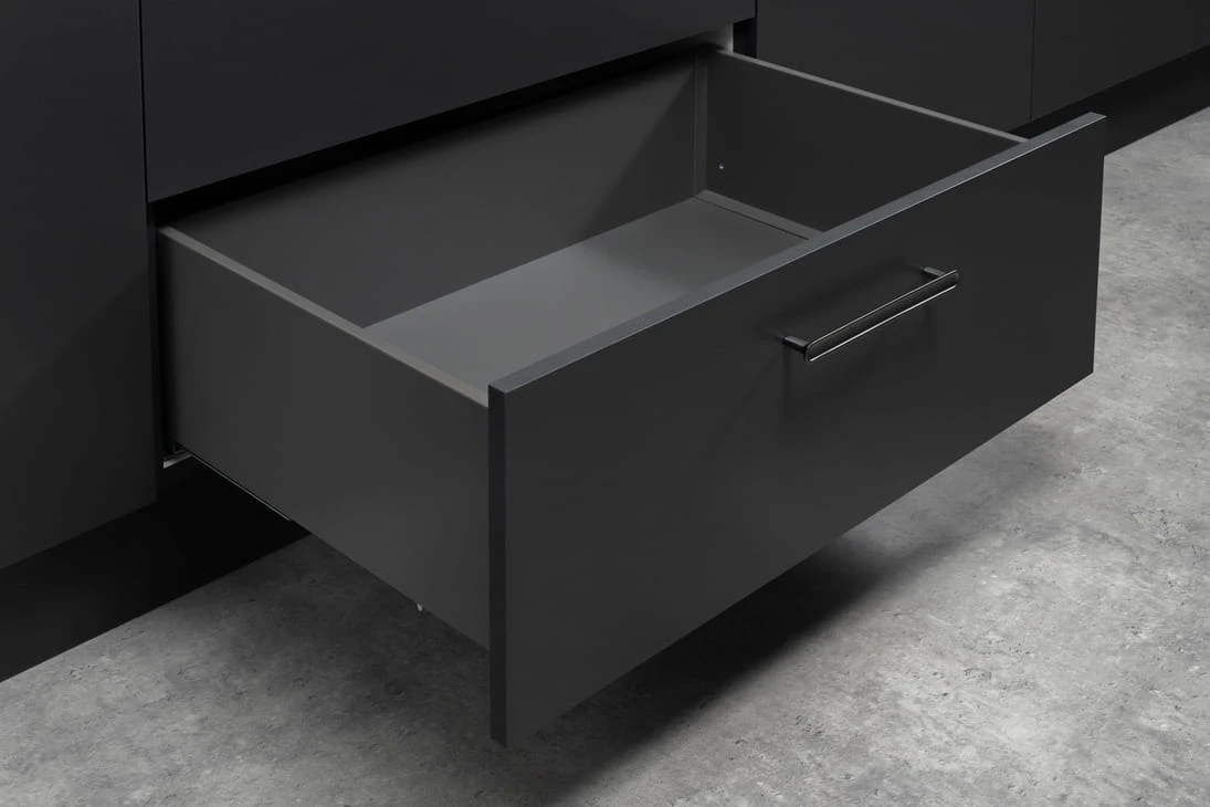 Minimalistyczna, cienkościenna szuflada Matrix S Slim stworzona do nowoczesnych mebli, zapewniająca pełny wysuw i cichy domyk.