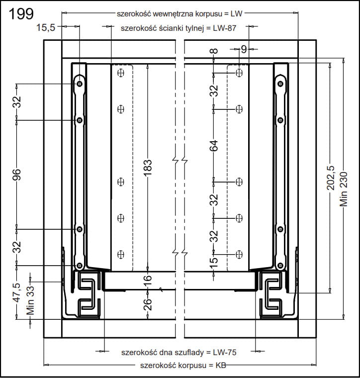- Wysokość szuflady: 199 mm