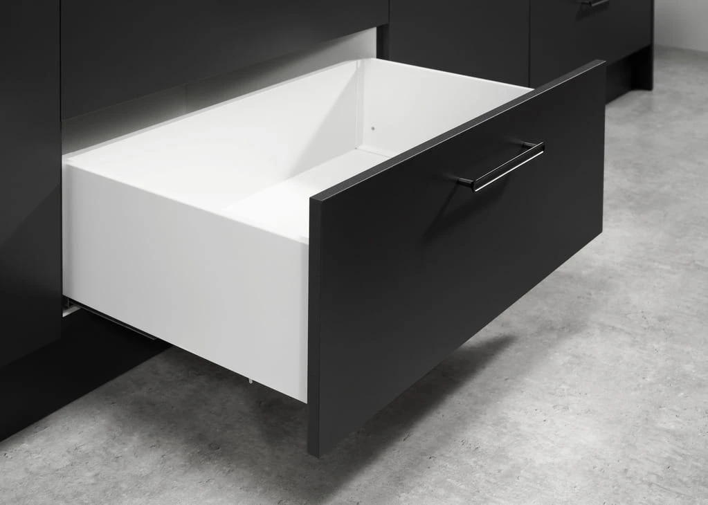 Minimalistyczna, cienkościenna szuflada Matrix S Slim stworzona do nowoczesnych mebli, zapewniająca pełny wysuw i cichy domyk.