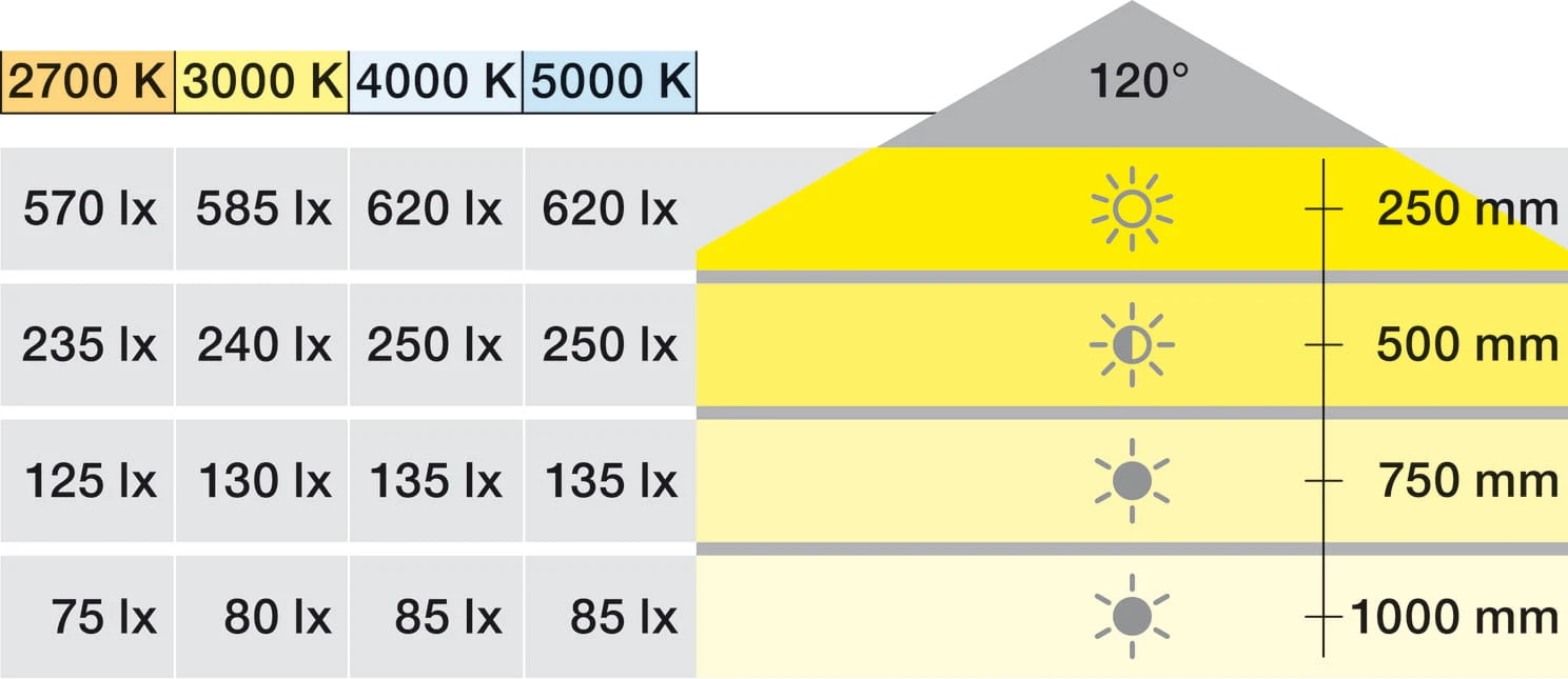 - Maksymalna długość taśmy (wizualna) oznacza odcinek taśmy, w obrębie którego spadek strumienia świetlnego nie jest dostrzegalny i wynosi maks. 30%. Uwaga: następujący bezpośrednio po nim odcinek taśmy z nowym zasilaniem jest wyraźnie jaśniejszy.