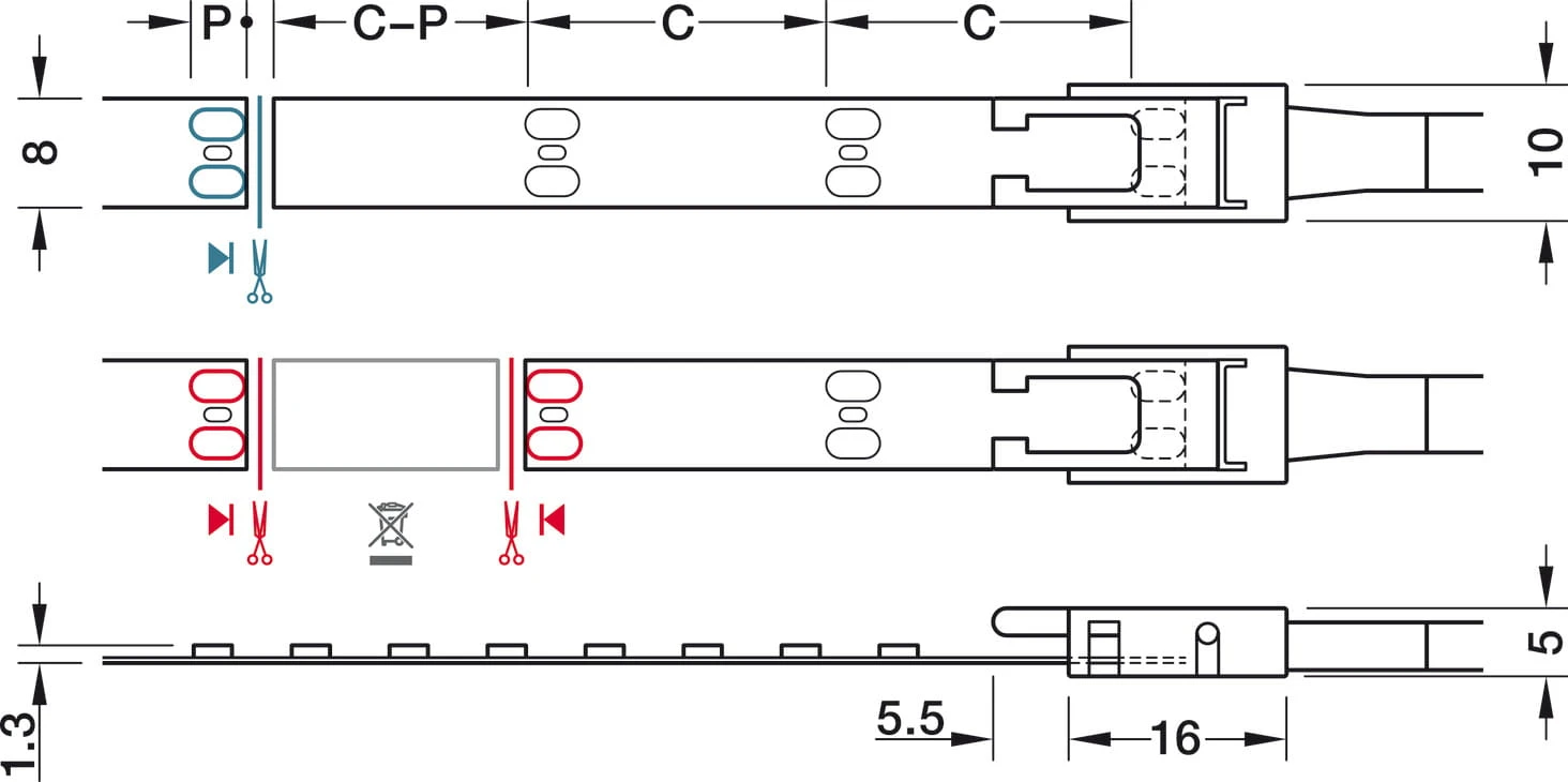 - Maksymalna długość taśmy (wizualna) oznacza odcinek taśmy, w obrębie którego spadek strumienia świetlnego nie jest dostrzegalny i wynosi maks. 30%. Uwaga: następujący bezpośrednio po nim odcinek taśmy z nowym zasilaniem jest wyraźnie jaśniejszy.