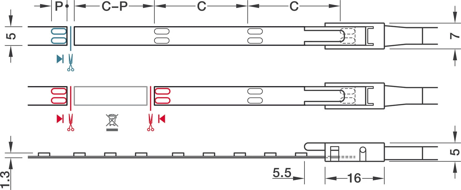 - Maksymalna długość taśmy (wizualna) oznacza odcinek taśmy, w obrębie którego spadek strumienia świetlnego nie jest dostrzegalny i wynosi maks. 30%. Uwaga: następujący bezpośrednio po nim odcinek taśmy z nowym zasilaniem jest wyraźnie jaśniejszy.