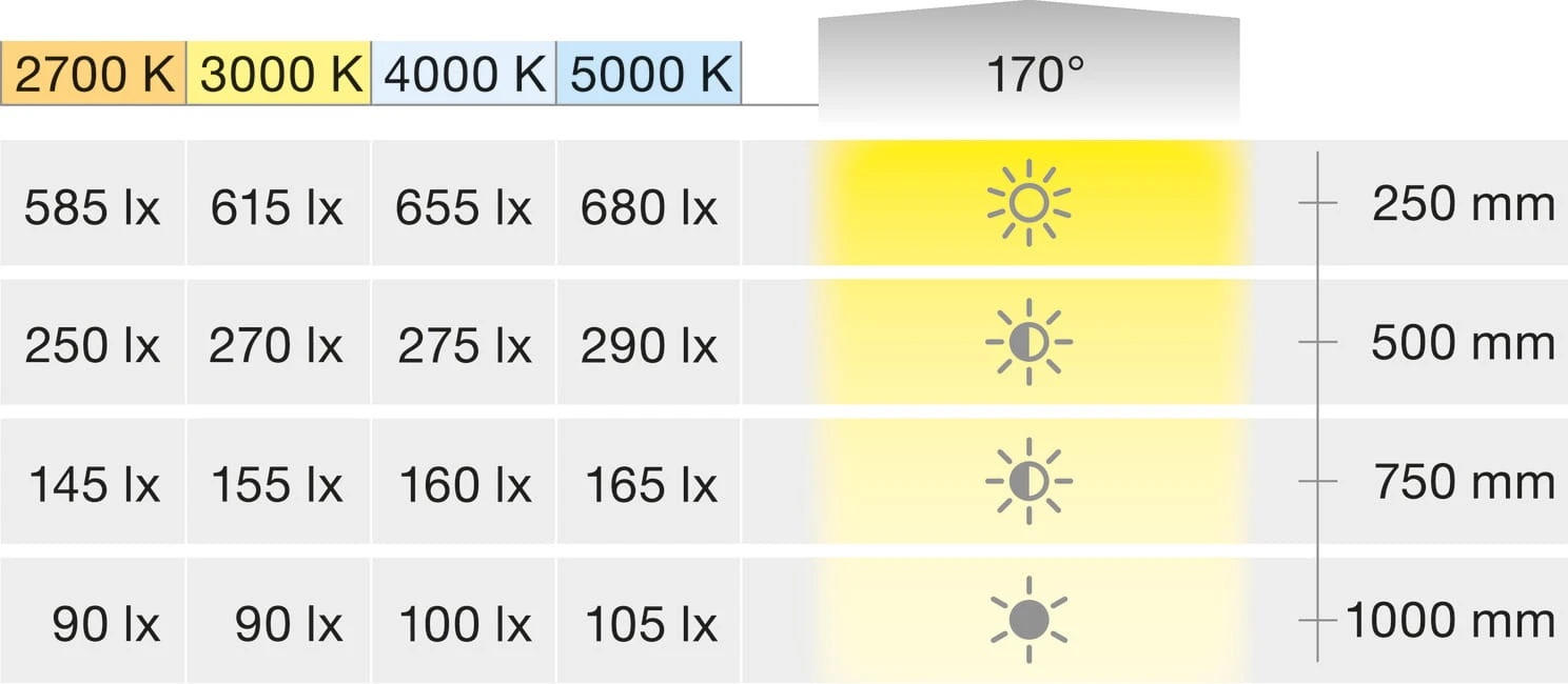- Maksymalna długość taśmy (wizualna) oznacza odcinek taśmy, w obrębie którego spadek strumienia świetlnego nie jest dostrzegalny i wynosi maks. 30 %.